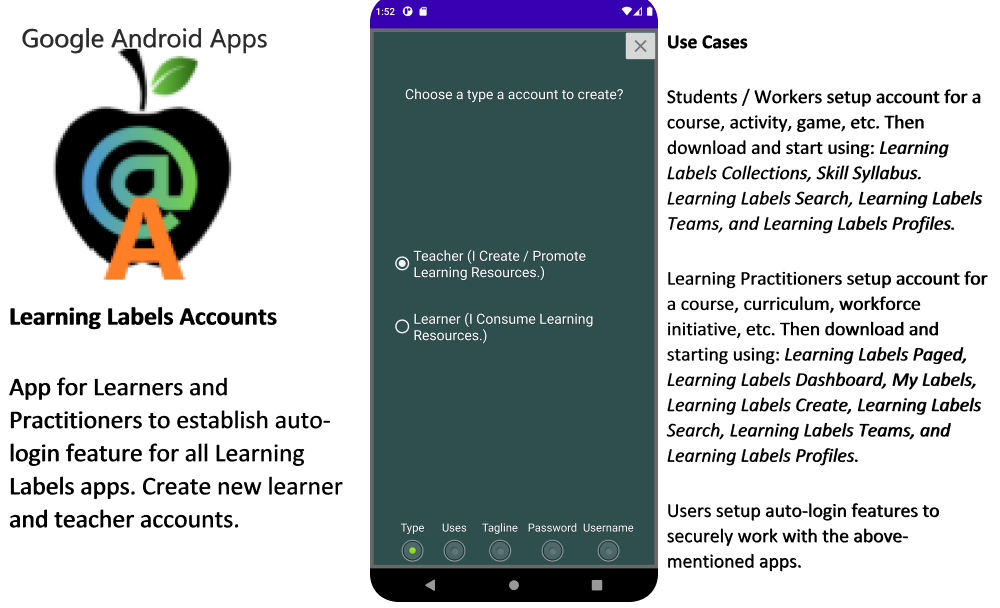 Learning Labels Accounts is now part of the suite of learning label apps (com.skillslabel) on Google Android. The primary functions of the app are to consolidate logins and the signup process and add more secure interactions. An initial version of the app is downloadable from Google Play.