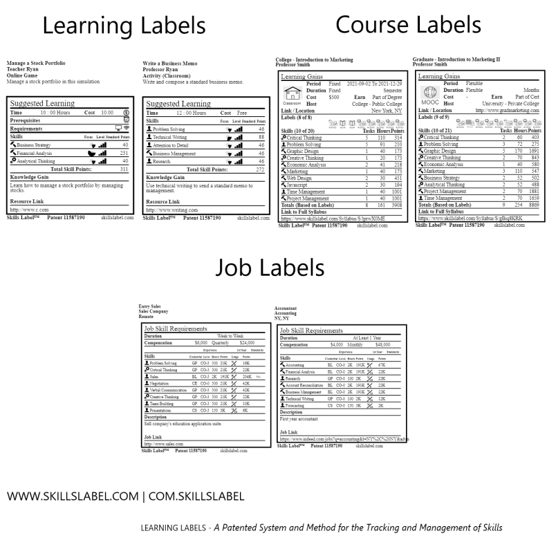 Learning, course, and job labels are part of a patented system to manage and track skills.
